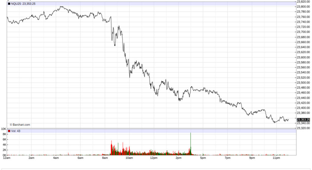 The Mini NASDAQ 100 futures experienced a notable decline on August 19, 2025, with contracts slipping 0.2% after a 1.4% drop, marking the second-worst decline since April’s tariff shock. This downturn was primarily driven by a significant sell-off in major technology and chipmaker shares, including a 3.5% slump in Nvidia Corp. and losses in AMD (nearly 5%) and Broadcom (4%), along with Palantir (over 9%). This indicates a “risk-off” sentiment and substantial profit-taking among traders following a robust 40% rally in the Nasdaq since April, coupled with concerns about stretched valuations (Nasdaq 100 trading at 27 times expected profits).